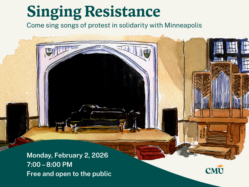Canadian Mennonite University will host a community-wide singing event, Singing Resistance, on Monday, February 2, at 7:00 PM in the Laudamus Auditorium at 500 Shaftesbury Blvd. The evening will bring together students, alumni, churches, and the wider public to sing songs of protest and courage, in solidarity with Minneapolis—part vigil, part community chorus—in response to the unsettling and often painful realities unfolding in the world today.